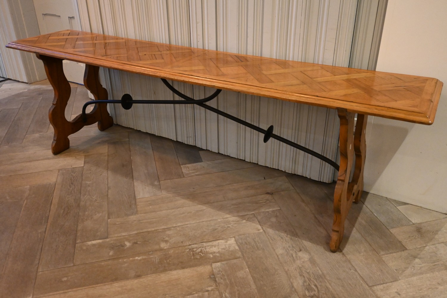 A SPANISH STYLE PARQUETRY TOP CONSOLE (A/F) (74H X 245W X 52D CM) (PLEASE NOTE THIS HEAVY ITEM MUST BE REMOVED BY CLIENTS OR CARRIERS AT THE CUSTOMERS EXPENSE. LEONARD JOEL STAFF CANNOT ASSIST CARRYING THIS ITEM)