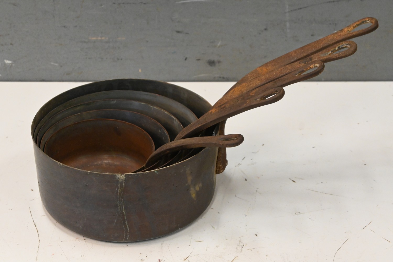 A SET OF FIVE COPPER SAUCEPANS (10H X 21D CM) (LEONARD JOEL DELIVERY SIZE: SMALL)