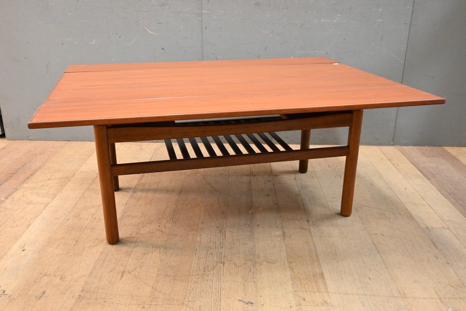 A MID CENTURY TEAK TWO TIER ADJUSTABLE HEIGHT COFFEE TABLE (54H X 125W X 96D CM) (LEONARD JOEL DELIVERY SIZE: LARGE)