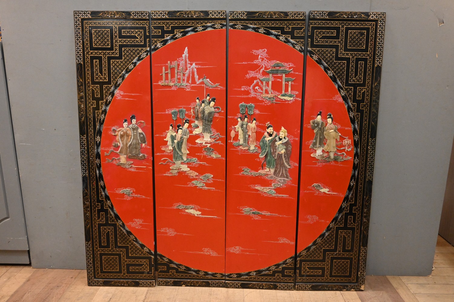 A CHINESE FOUR PANEL WALL HANGING WITH MOTHER OF PEARL/SOAP STONE INLAY (A/F) (EACH 179H X 46W CM) (LEONARD JOEL DELIVERY SIZE: X-LARGE)