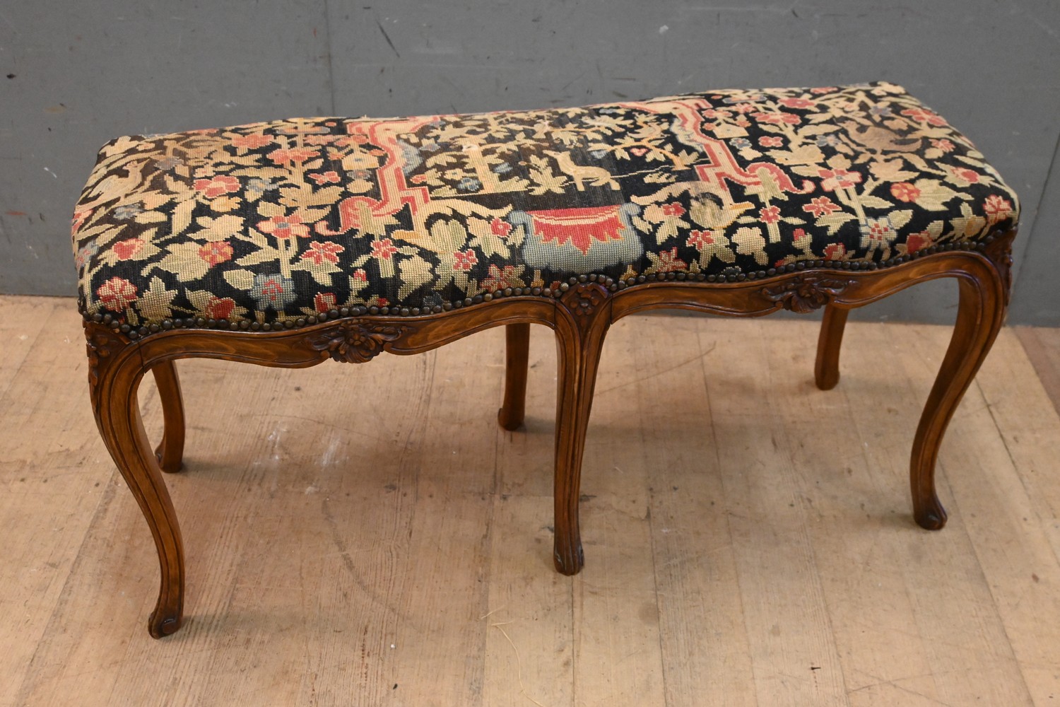 A LOUIS XV STYLE UPHOLSTERED BENCH SEAT (A/F) (52H X 105W X 41D CM) (LEONARD JOEL DELIVERY SIZE: LARGE)