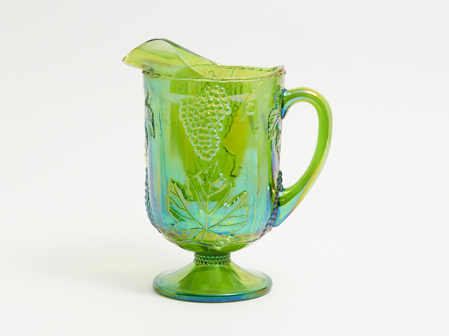 A VINTAGE GREEN CARNIVAL GLASS GRAPE AND LEAF DECORATED JUG H.26.5CM, LEONARD JOEL LOCAL DELIVERY: SMALL