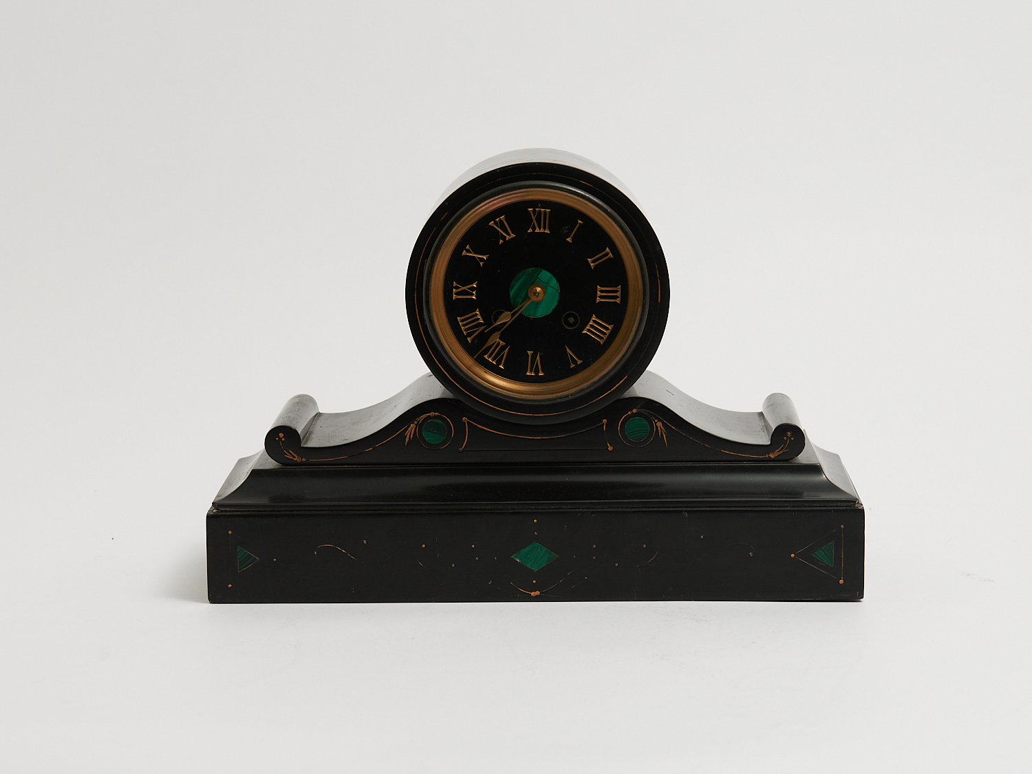 A FRENCH BLACK MARBLE INLAID WITH MALACHITE STONE MANTLE CLOCK WITH KEY W.35CM, LEONARD JOEL LOCAL DELIVERY: MEDIUM