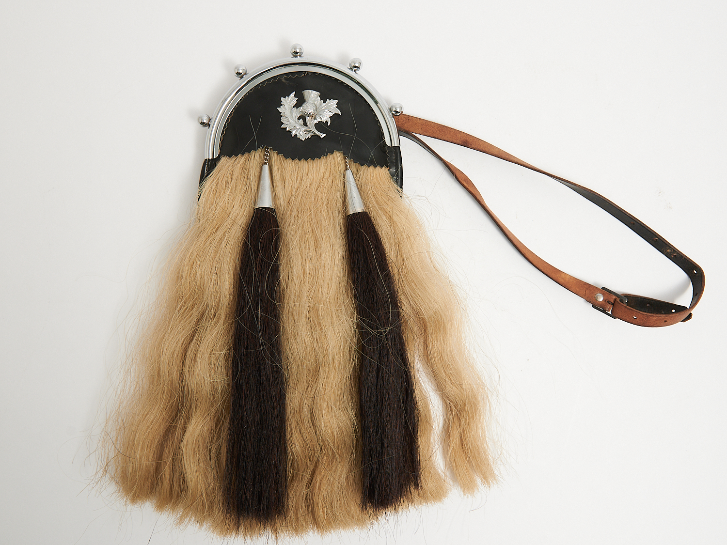 LARGE ANTIQUE 1900S CENTURY SCOTTISH LEATHER AND HAIR SPORRAN WITH SILVER SCOTCH THISTLE DECORATION L.43CM, LEONARD JOEL LOCAL DELIVERY: SMALL