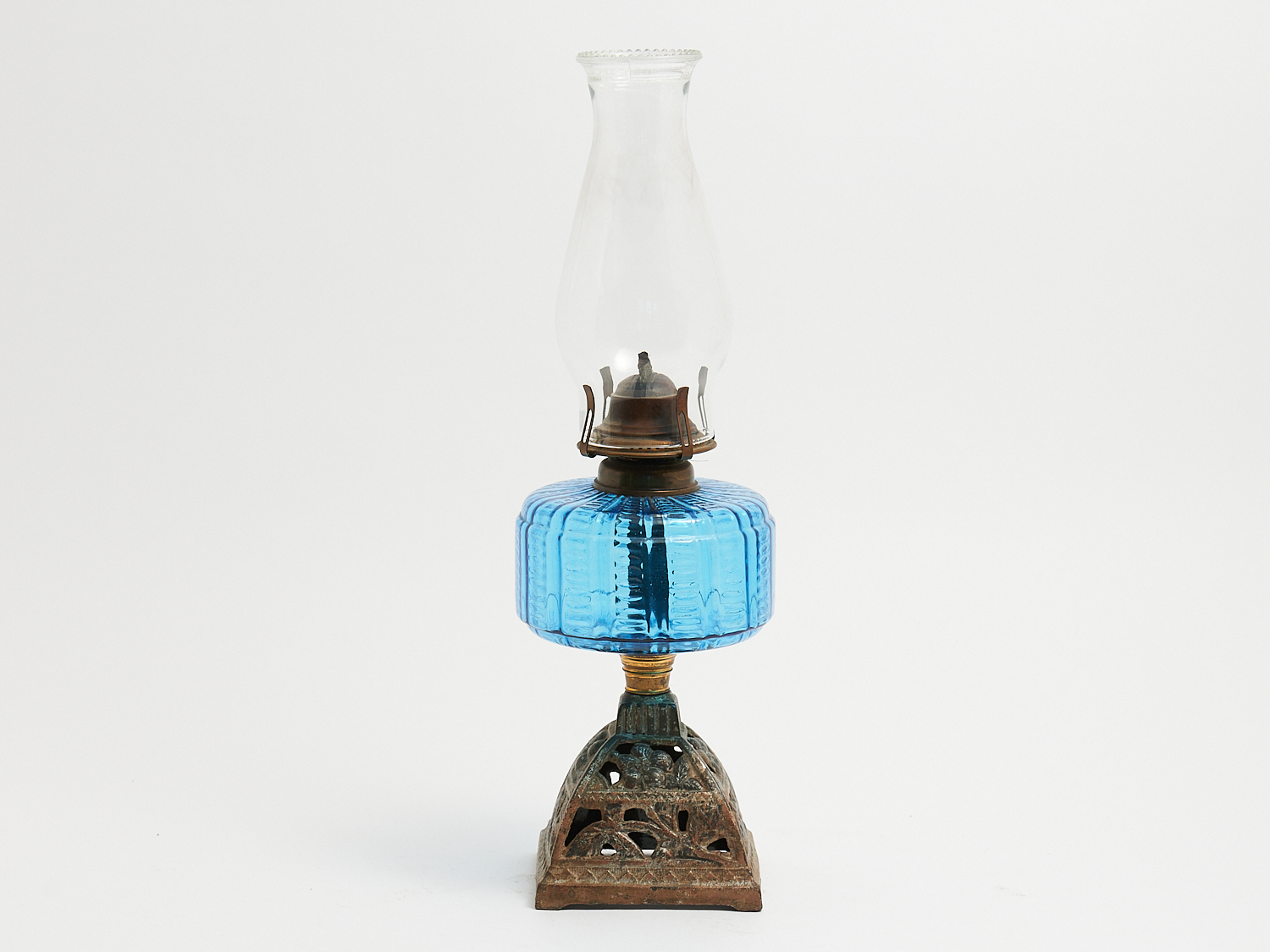 A VICTORIAN BLUE GLASS AND CAST IRON BASED OIL LAMP H.47CM, LEONARD JOEL LOCAL DELIVERY: MEDIUM