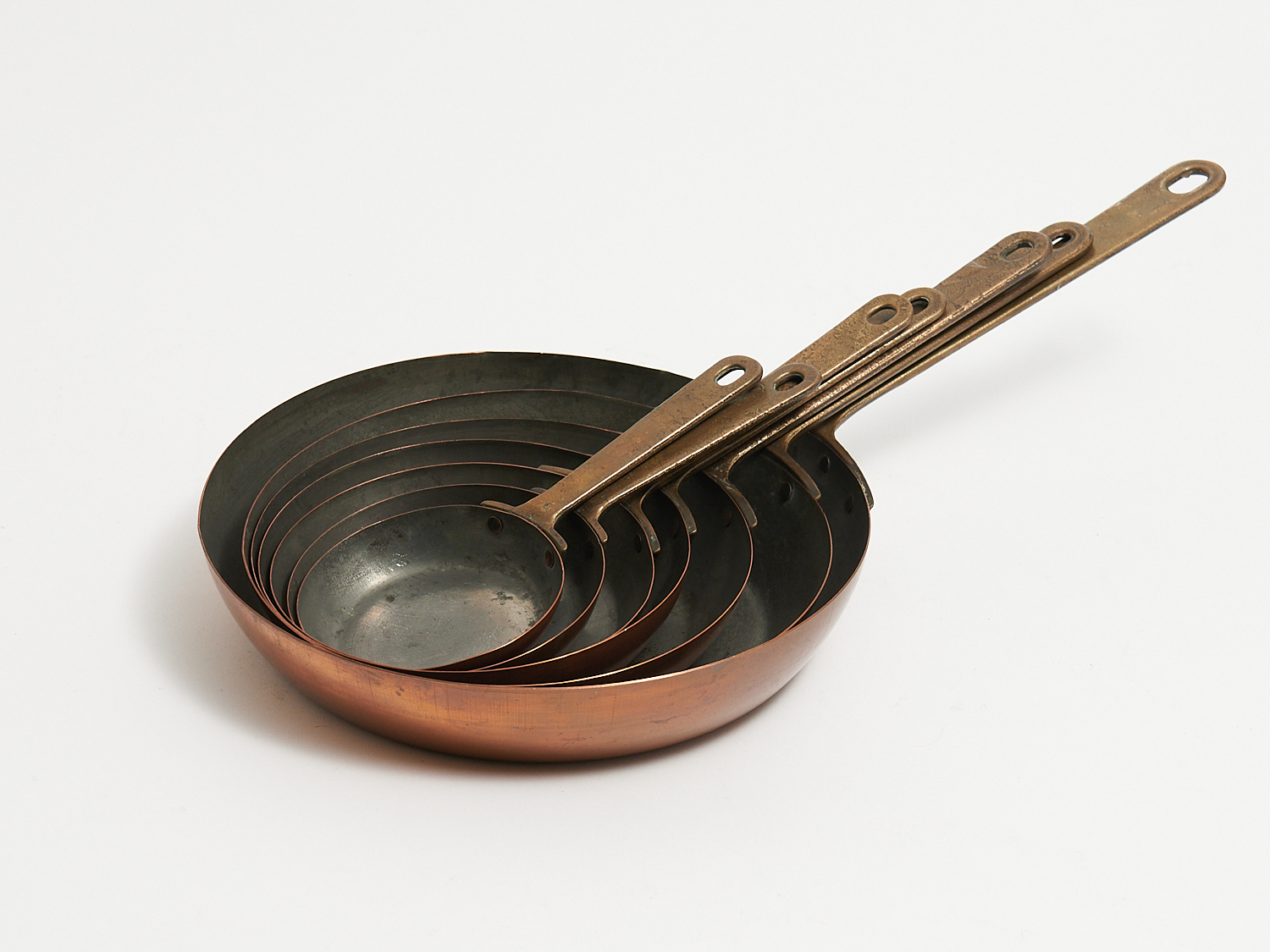 A SET OF SIX FRENCH COPPER AND BRASS HANDLED GRADUATED FRYPANS DIA.22.8CM (LARGEST), LEONARD JOEL LOCAL DELIVERY: MEDIUM