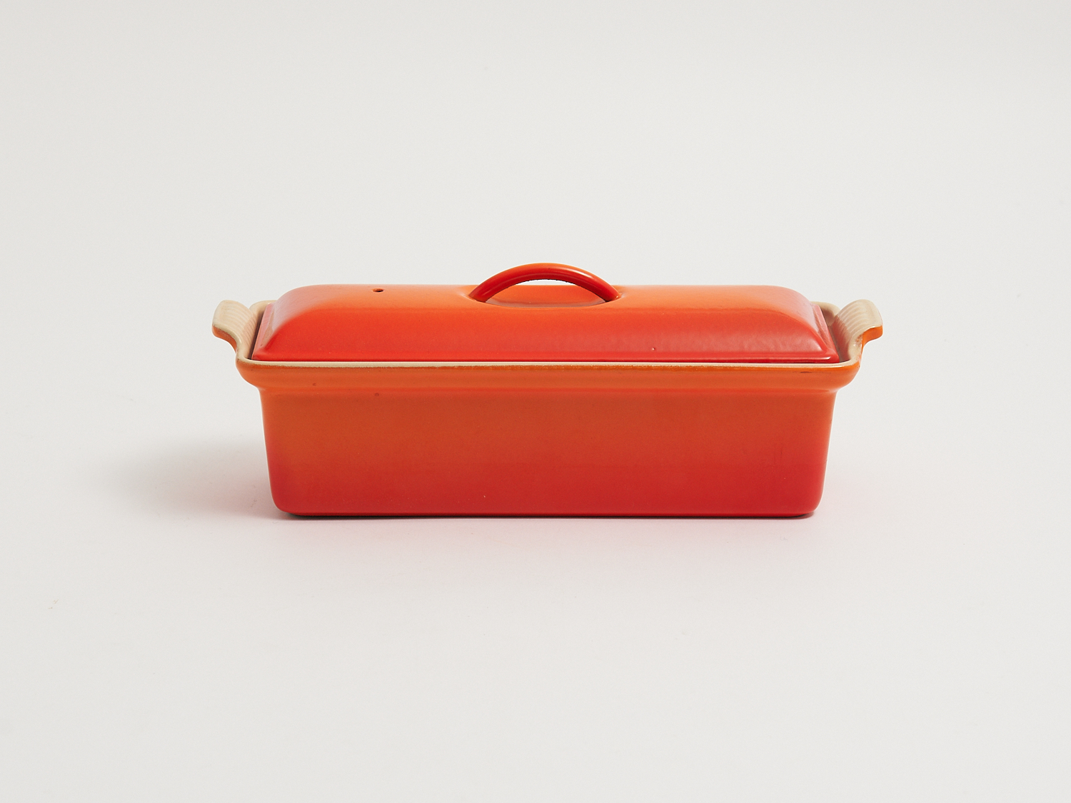 A FRENCH LE CRUSET ORANGE LIDDED RECTANGULAR CASEROLE DISH W.30.5CM, LEONARD JOEL LOCAL DELIVERY: SMALL