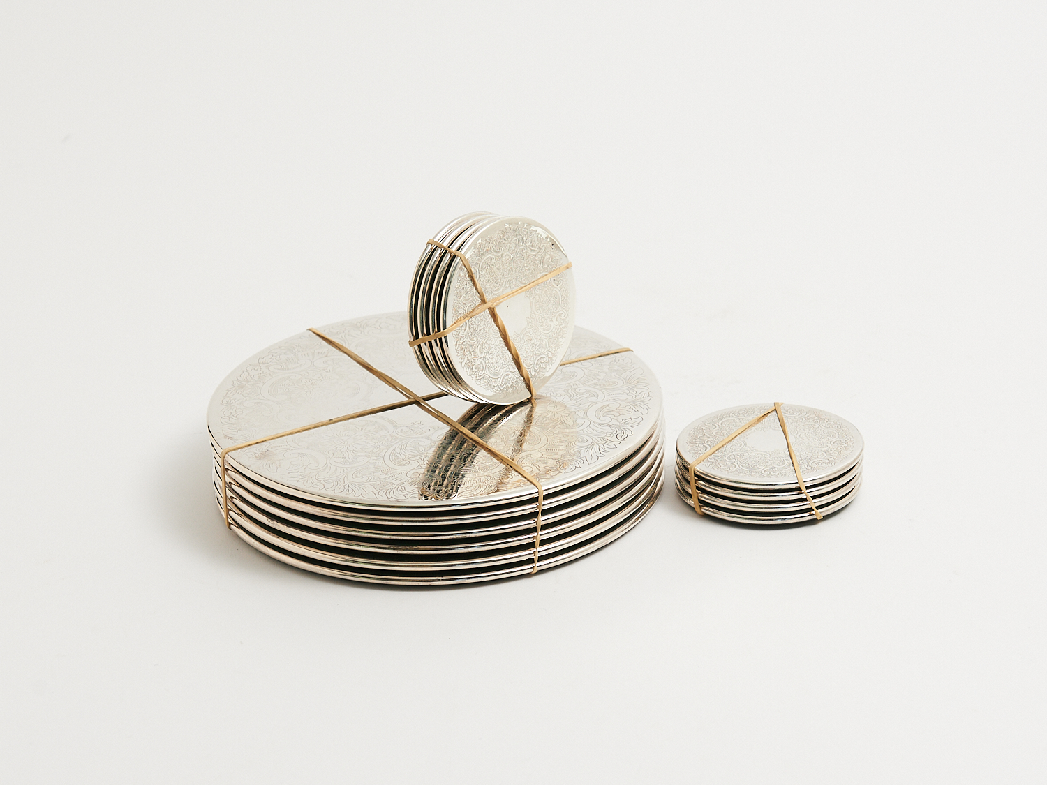 COLLECTION OF SIX STRACHAN SILVERPLATED PLACEMATS AND TVELVE MATCHED DRINK COASTERS DIA.20.5CM AND DIA.8.5CM, LEONARD JOEL LOCAL DELIVERY: SMALL
