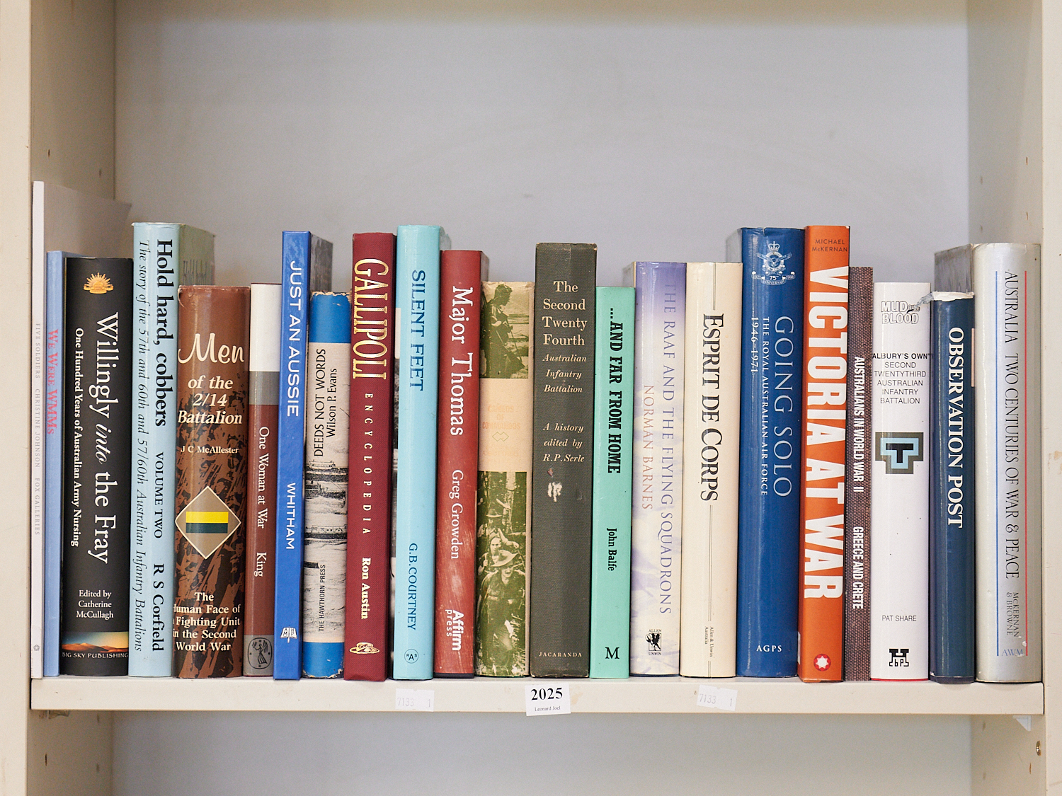 SHELF OF AUSTRALIAN MILITARY HISTORY INCLUDING "ESPOIT DE CORPS - THE HISTORY OF THE VICTORIAN SCOTTISH REGIMENT AND THE FIFTH INFANTRY BATTALION" (1ST EDITION 1988), J.C. MCALLESTER "MEN OF THE 2/14 BATTALION" (1990), PAT SHARE "MUD AND BLOOD", WILSON P. EVANS "DEEDS NOT WORDS - THE VICTORIAN NAVY" (1ST EDITION 1971), LEONARD JOEL LOCAL DELIVERY: MEDIUM
