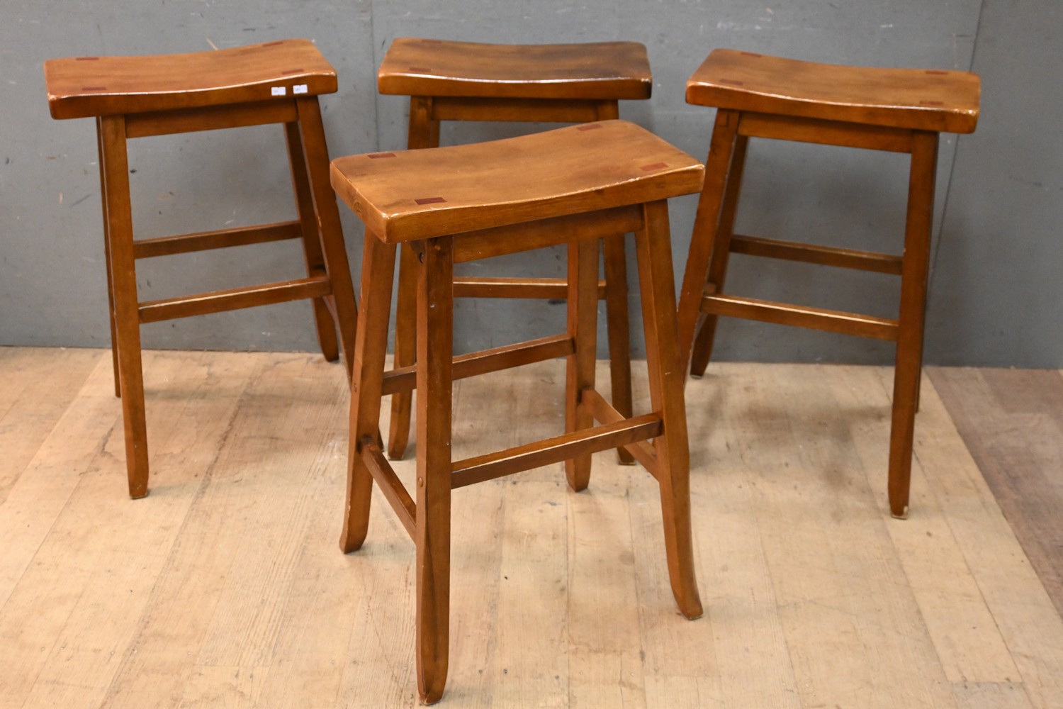 A SET OF FOUR JAPANESE TIMBER STOOLS (A/F) (70H X 46W X 39D CM) (LEONARD JOEL DELIVERY SIZE: LARGE)