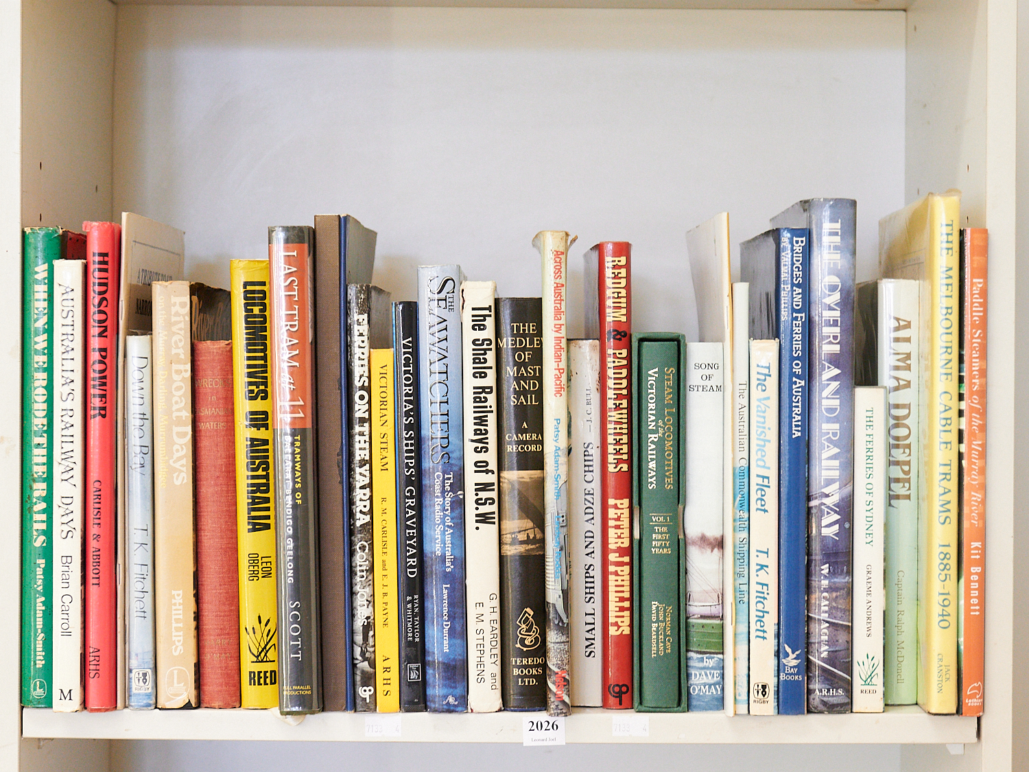 SHELF OF AUSTRALIAN TRANSPORT HISTORY INCLUDING "STEAM LOCOMOTIVES OF THE VICTORIAN RAILWAYS" (VOLUME 1 IN SLIPCASE), "A HISTORY OF THE REDESDALE RAILWAY LINE 1891 - 1954", "THE SHALE RAILWAYS OF NSW", "THE MELBOURNE CABLE TRAMS 1885 - 1940", "RAILS TO WALHALLA", LEONARD JOEL LOCAL DELIVERY: MEDIUM