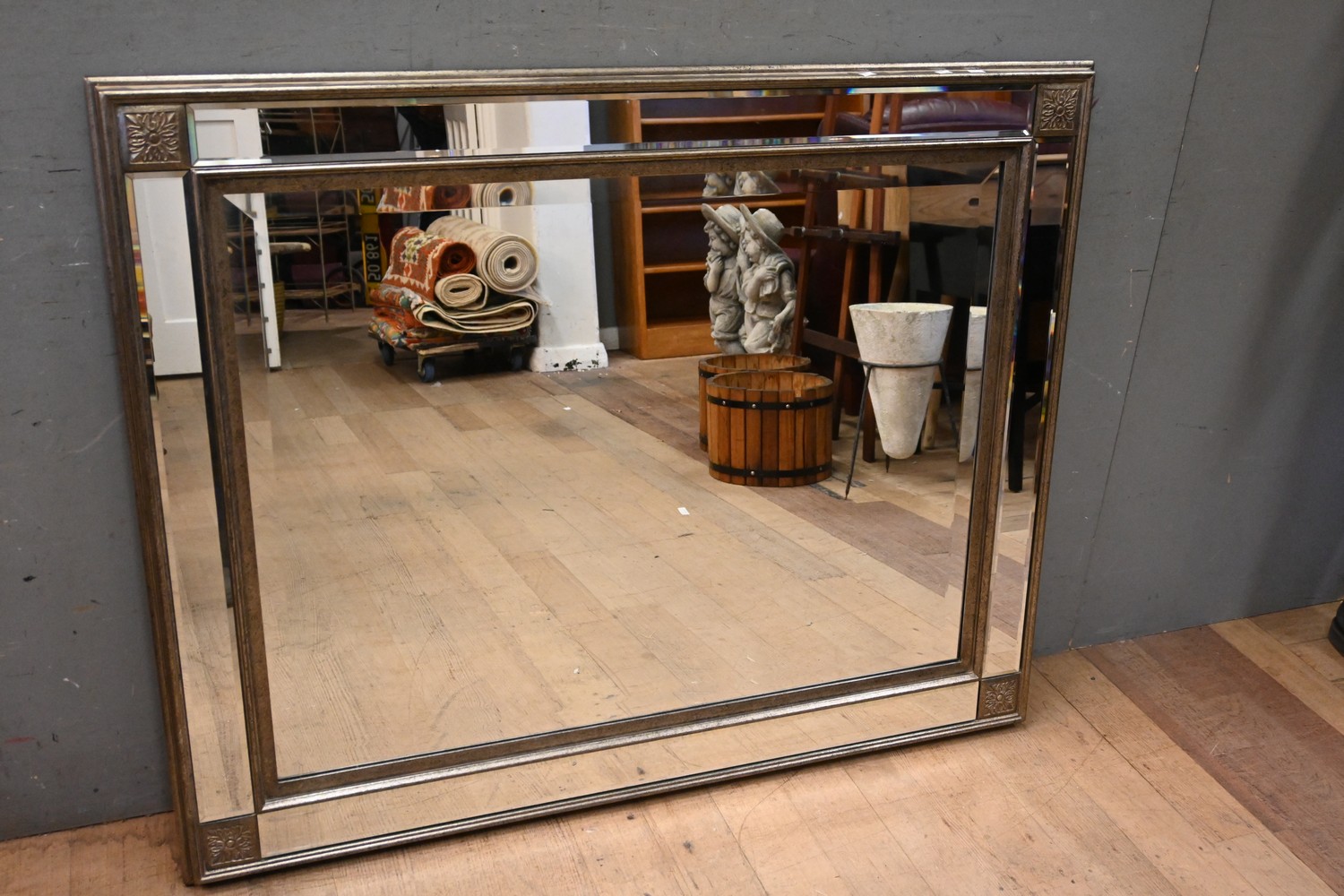 A LARGE BEVELLED EDGE MIRROR WITH CARVED DETAILING (101H X 126W CM) (LEONARD JOEL DELIVERY SIZE: LARGE)