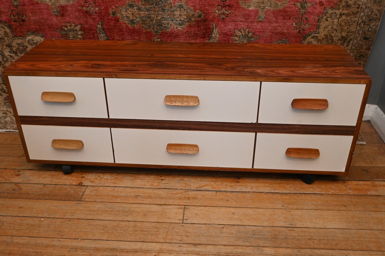 A LOWLINE SIX DRAWER CONSOLE ON CASTORS (A/F) (55H X 150W X 44D CM) (LEONARD JOEL DELIVERY SIZE: X-LARGE)