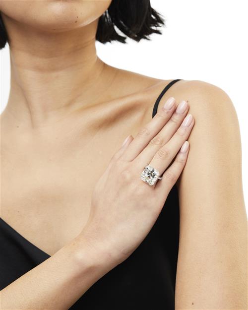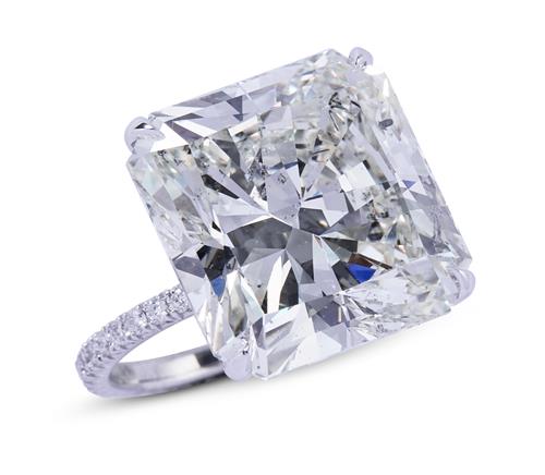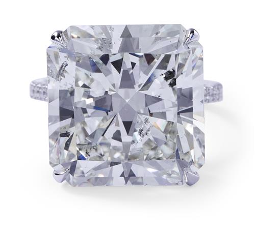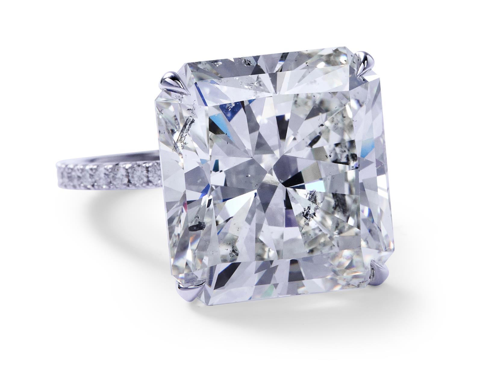 The cut-cornered square modified brilliant-cut diamond weighing 21.13 carats, is claw-set to a hoop continuously pavé-set with brilliant-cut diamonds, the small diamonds together weighing approximately 1.13 carats, mounted in platinum, size L1/2.