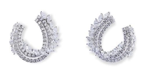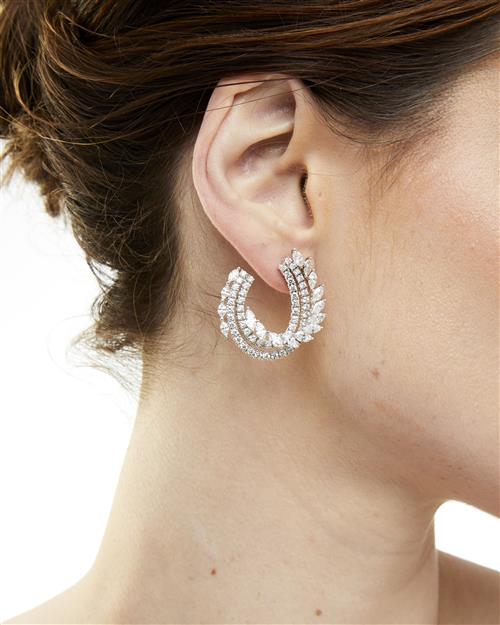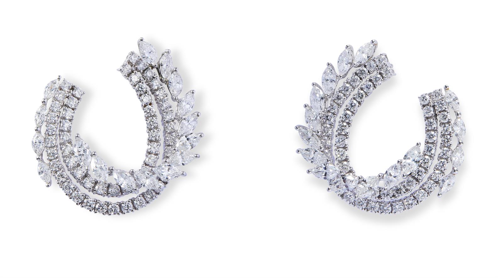 Each elliptical hoop of organic design decorated with lines of brilliant-cut and marquise-shaped diamonds, the diamonds together stated to weigh 8.35 carats, mounted in 18ct white gold, length 32mm, post and clip fittings.