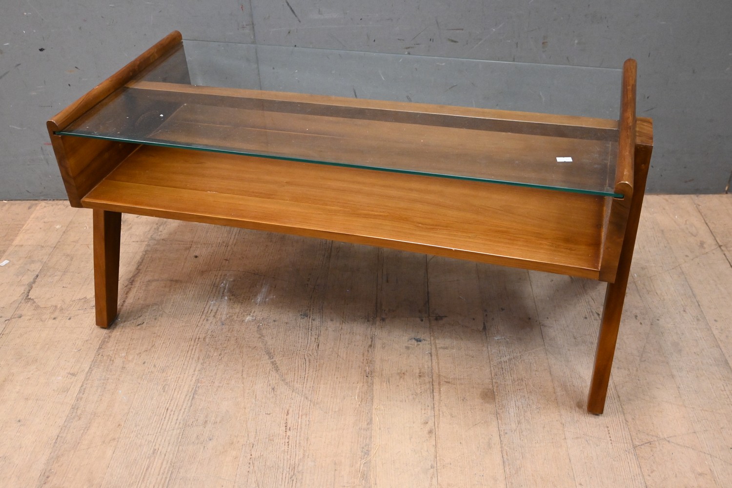 A MID-CENTURY STYLE TEAK GLASS TOP COFFEE TABLE (44H X 102W X 46D CM)(LEONARD JOEL DELIVERY SIZE: LARGE)
