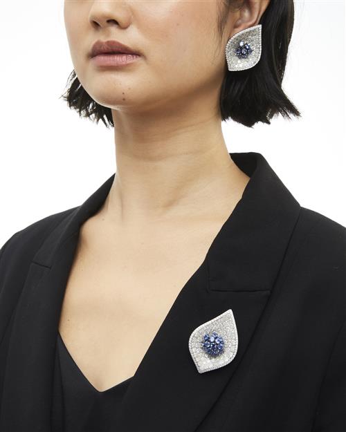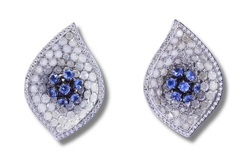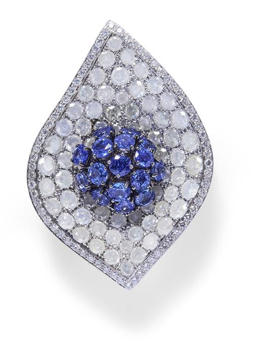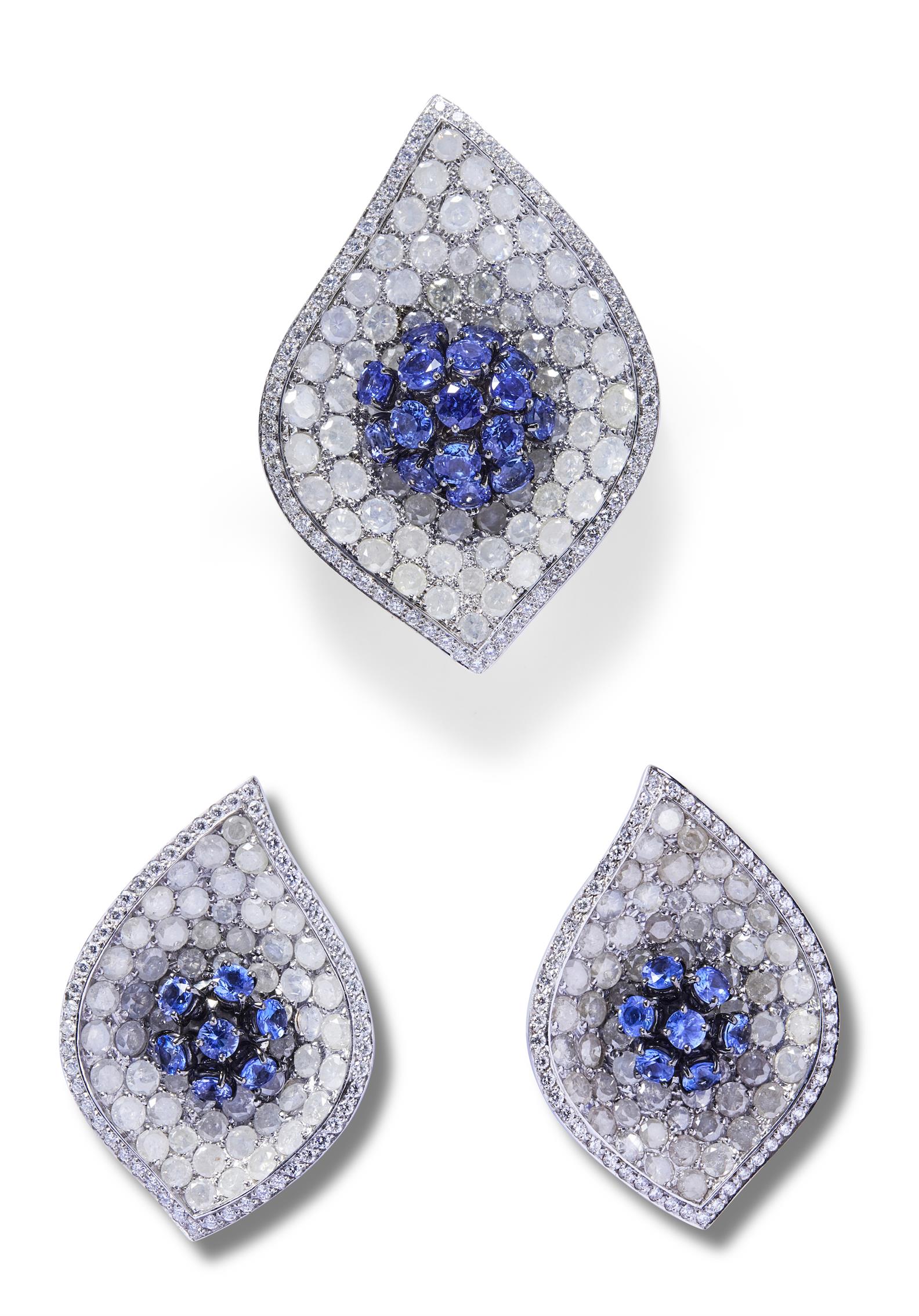 Comprising: a pair of earrings of foliate design, centring a cluster en tremblant claw-set with circular-cut sapphires surmounted above bead-set fancy white brilliant-cut diamonds, the edge pavé-set with near colourless diamonds, length 46mm, width 31mm; a brooch ensuite, length 54mm, width 38mm, numbered B0369, maker's marks, signed de Grisogono (2).