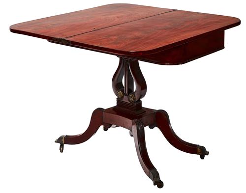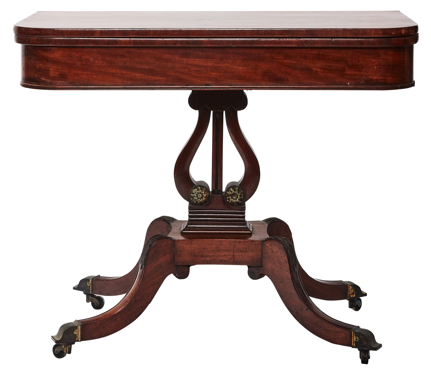 The D-shaped fold over top on a plain frieze and a brass mounted lyre-shaped pedestal and four swept legs with leaf carved knees terminating in fluted castors.