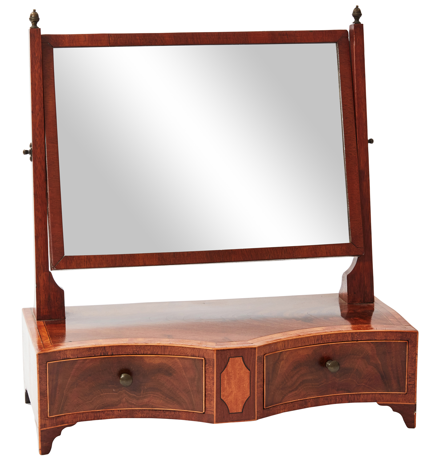The rectangular plate above two shaped drawers with boxwood lines and satinwood crossbanding throughout.