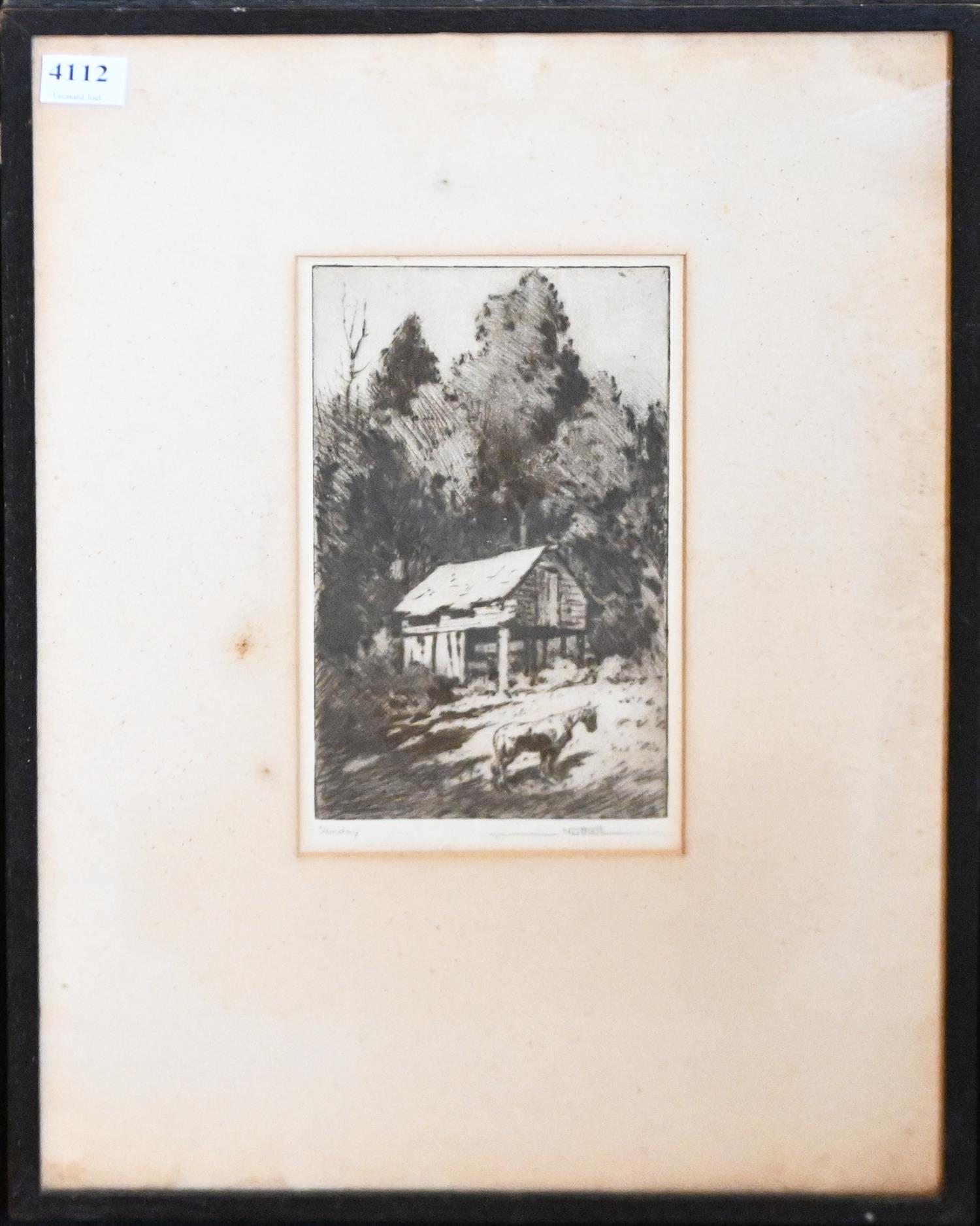 Foxing to work, as well as discolouration due to age and mount burn along edges of work and inner mount. Significant fly spotting and foxing across mount. Hanging wire is unstable.