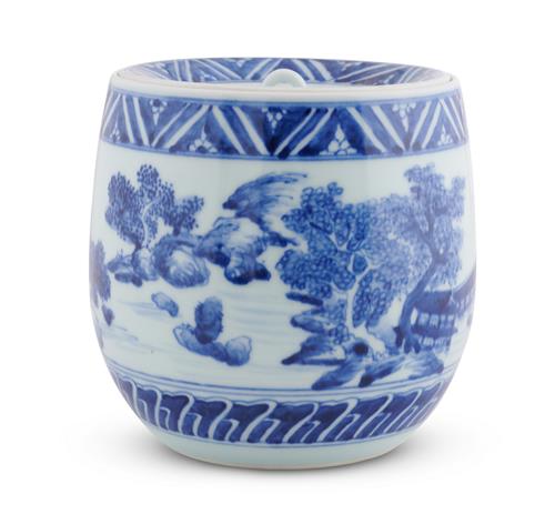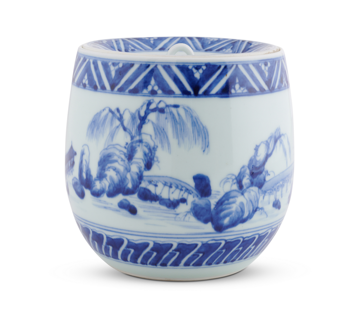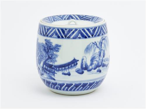 Of ovoid form decorated with a Chinese literati style lakeside landscape with pavillions, bridges and islands. Six character mark to the base reading 'Kachutei Dohachi zo' for Dohachi IV.