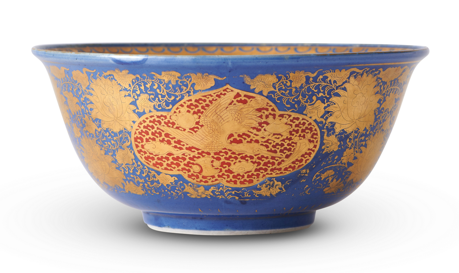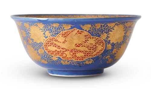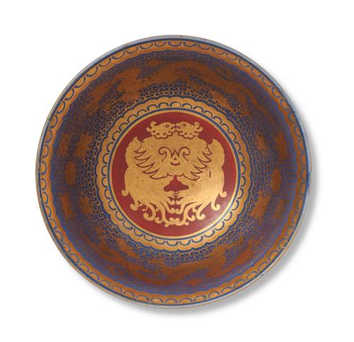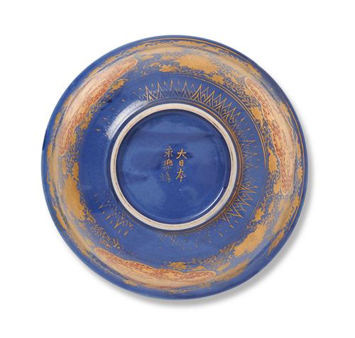 Decorated with a cobalt blue glaze, an iron red roundel to the interior centre and three shaped reserves to the exterior, the whole covered in intricate gilded decoration of dragons, precious objects, phoenixes, cranes and scrolling lotus. Six character mark 'Dai Nihon Eiraku zo' to base.