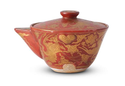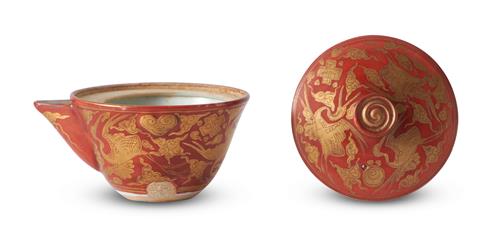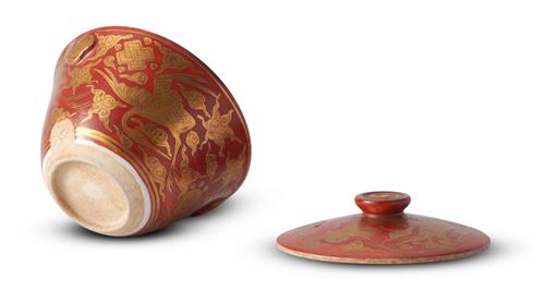 Decorated in kinrande style with gilded cranes flying amongst clouds and precious emblems on an iron red enamel ground. Impressed seal of Eiraku Wazen to the side near the foot rim.
