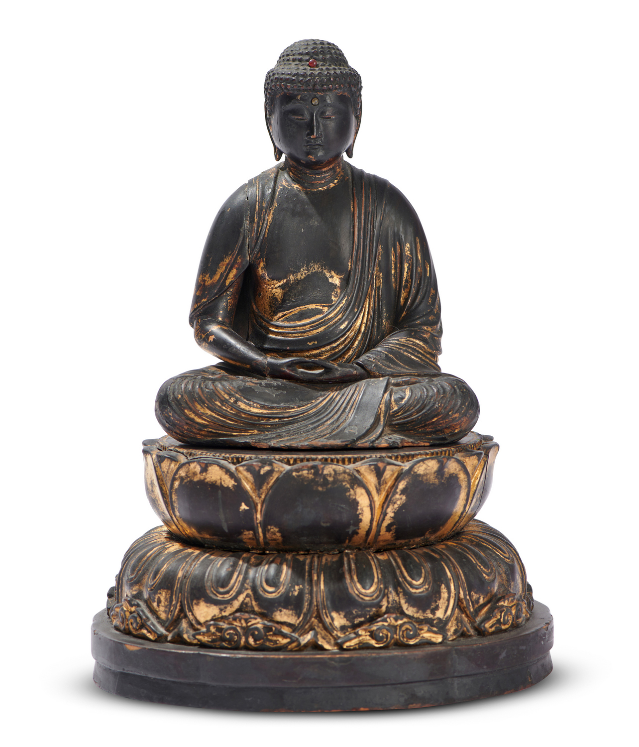 Constructed using yosegi-zukuri (assembled from several pieces of wood) technique, sensitively carved as a Buddha figure seated in padmasana with hands clasped in dhyanamudra on a double lotus throne, the head inset with two rock crystal cabochons.