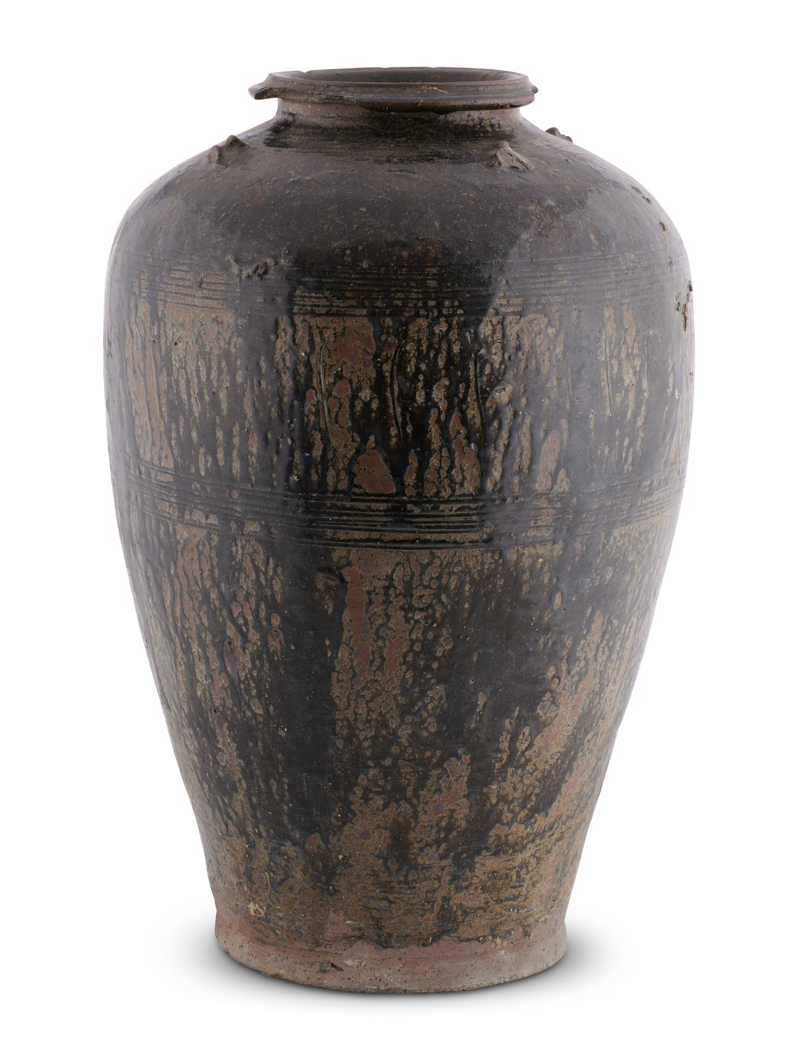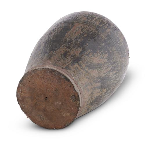 The large stoneware jar in baluster form with a widely everted mouth rim, decorated with horizontal lines and combed patterns, four lug handles, the whole covered in a rich deep blackish-brown iron glaze.