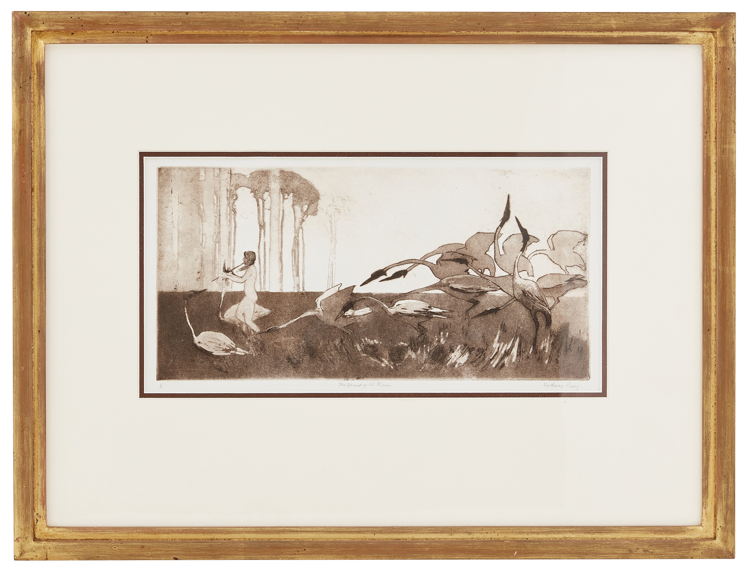 signed, titled and inscribed below image: B 'The Spirit of the Plains' Sydney Long