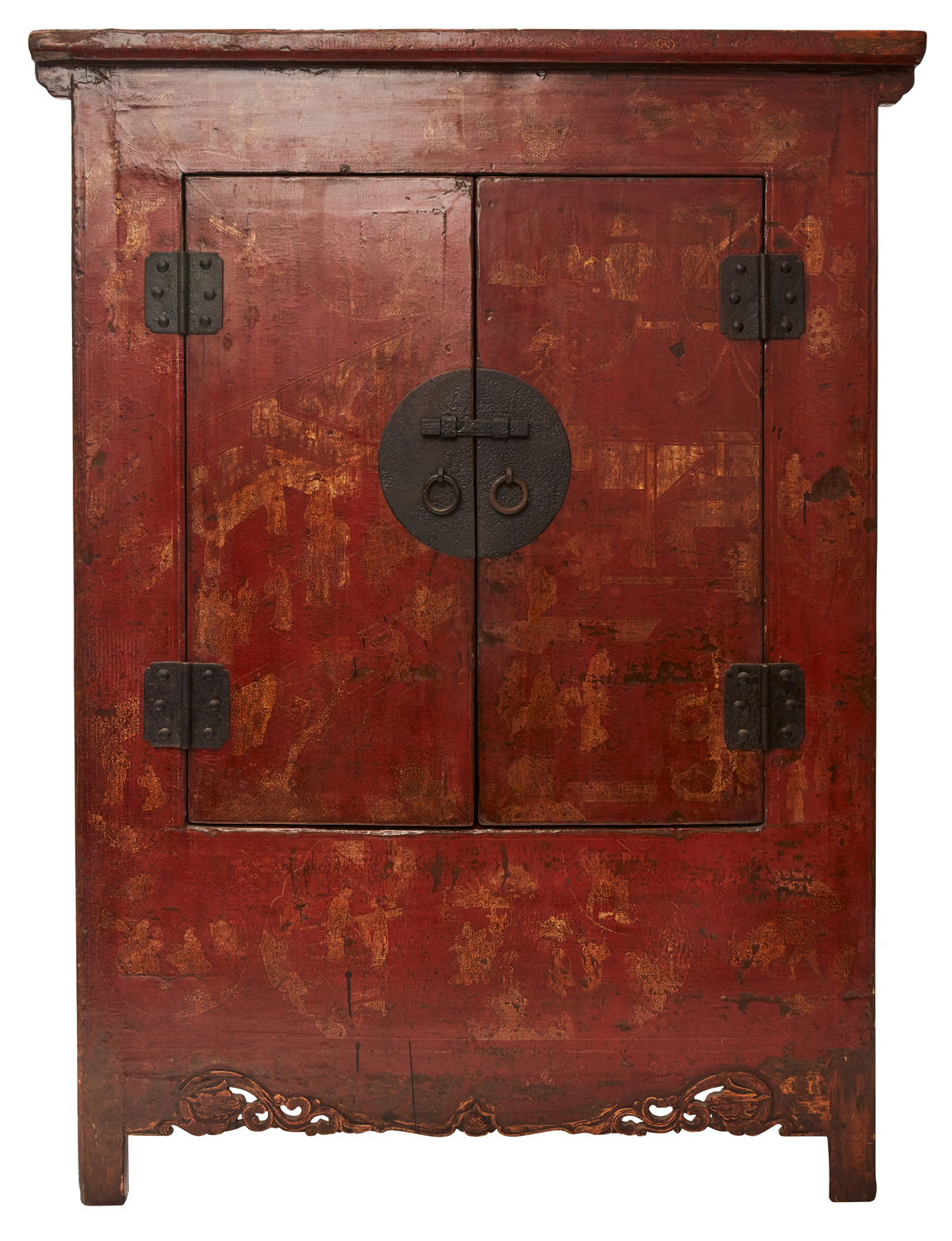 Qing Dynasty (1644-1912), 17th/18th century, the overhanging bracketed cornice above a pair of doors with iron hardware opening to reveal shelves and drawers above a compartment base, decorated with faded gold lacquer of court scenes on a red ground.