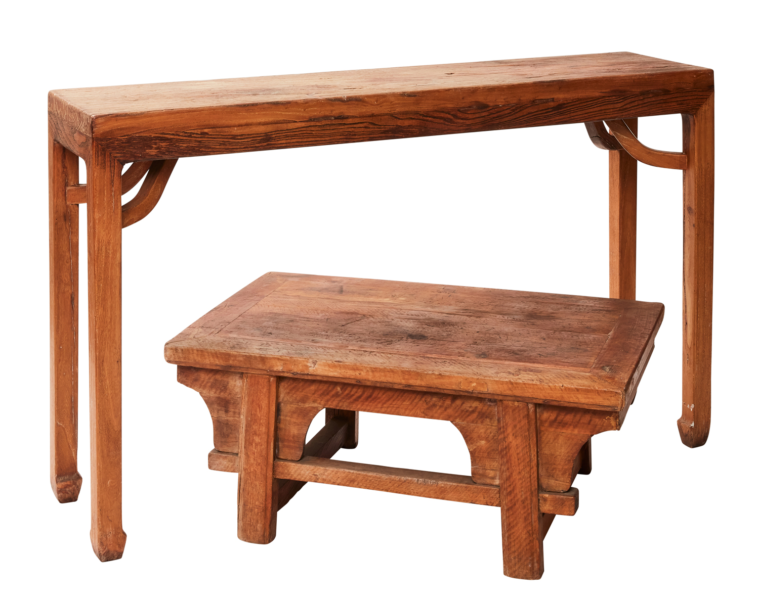 The painting table: Qing Dynasty (1644-1912), circa 18th century, the plain rectangular top with giant-arm braces to the square tapering legs with scrolled toes; the low table on solid moulded supports with shaped aprons and stretchers.