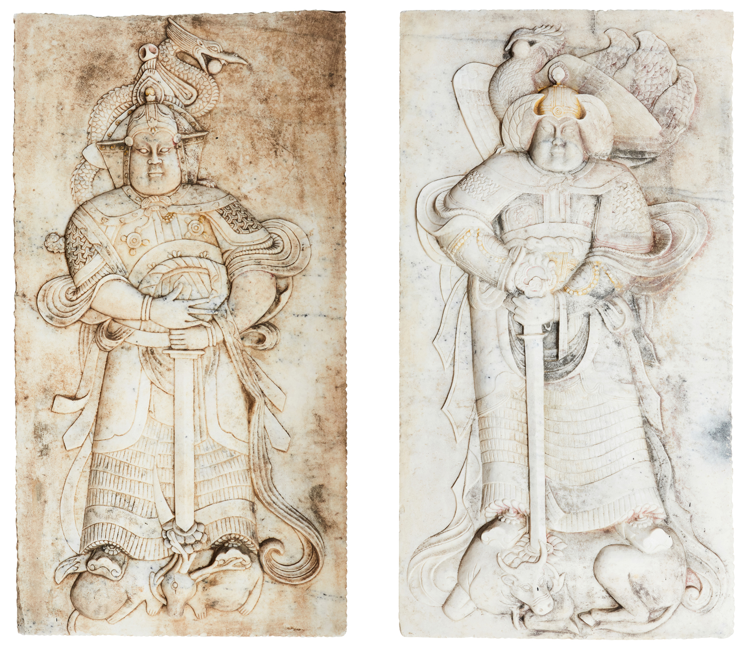 Each carved with a Ming warrior in full armour, one standing on an ox, the other on a deer.