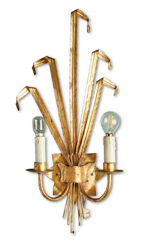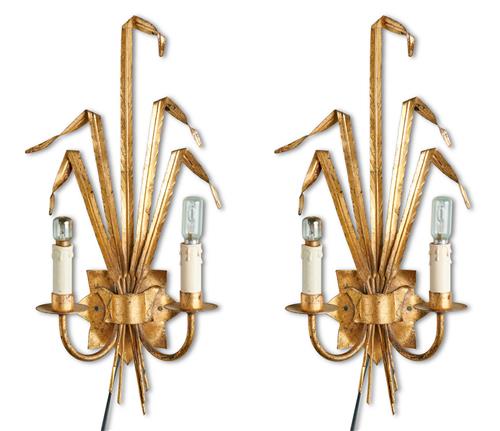 Pair of metal gilded tole reed wall lights.