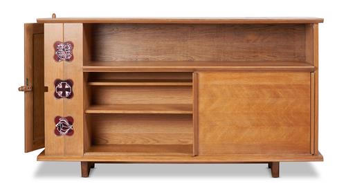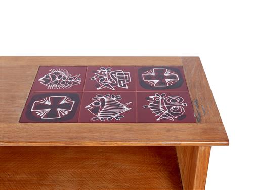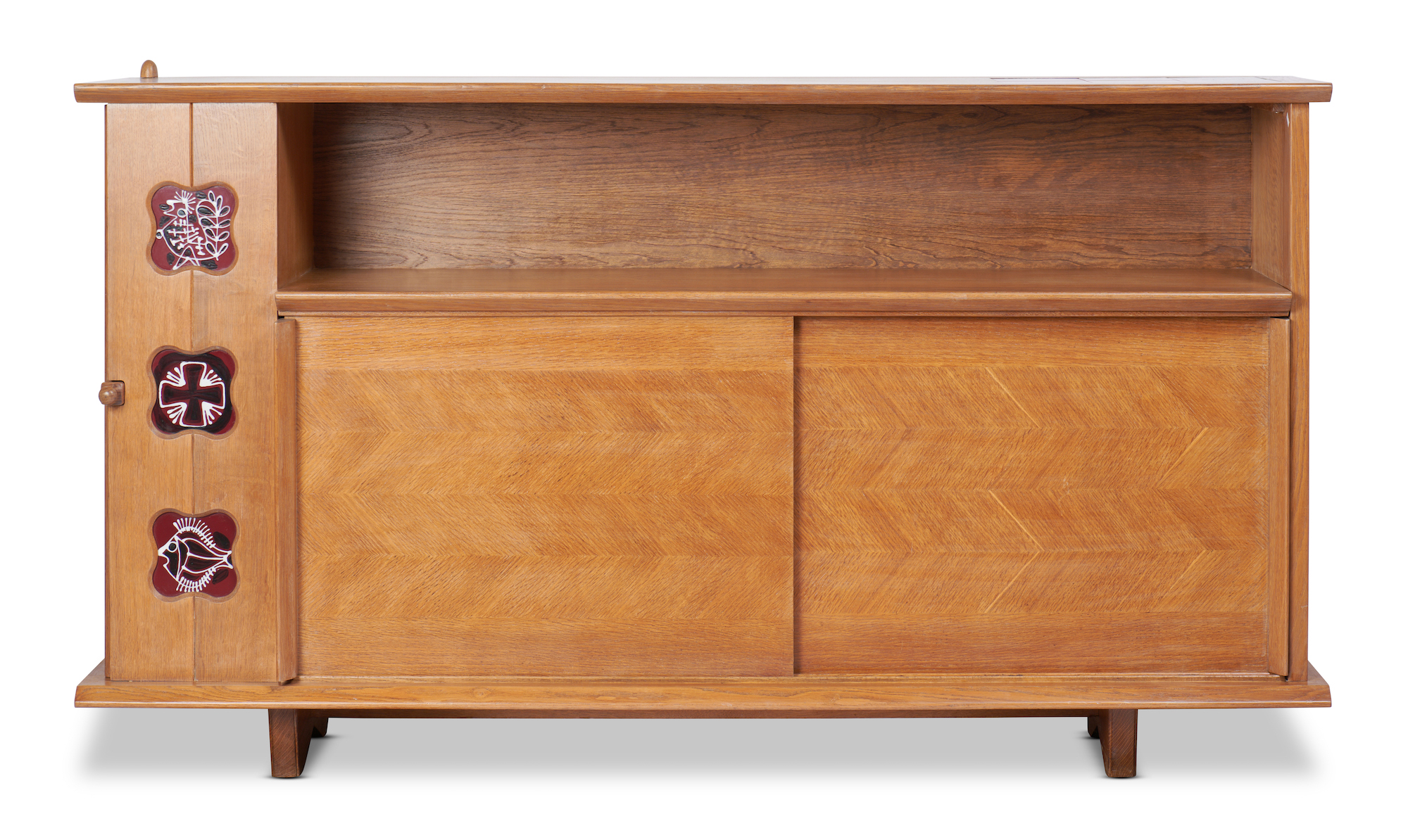 Minor surface scratches and staining to body of oak sideboard consistent with age and use. Hairline crack to 3 top tiles. Original condition, and structurally sound.