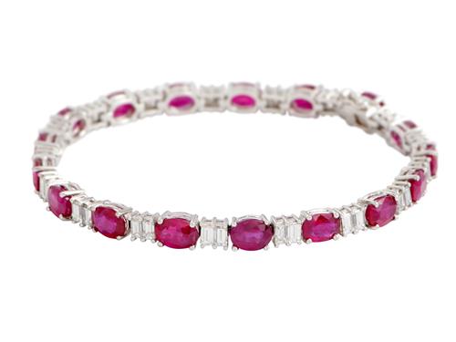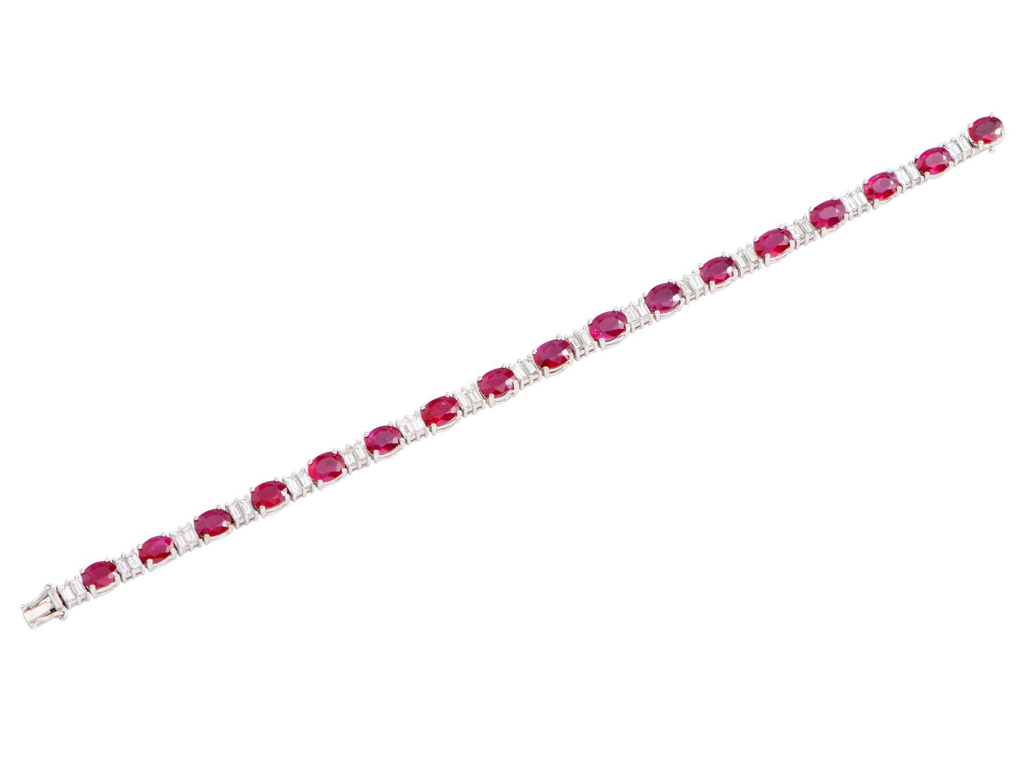 Of line design, comprising seventeen claw-set oval-cut rubies together weighing approximately 13.14 carats, spaced by pairs of claw-set baguette-cut diamonds together weighing approximately 3.04 carats, completed by a box clasp, length approximately 175mm.