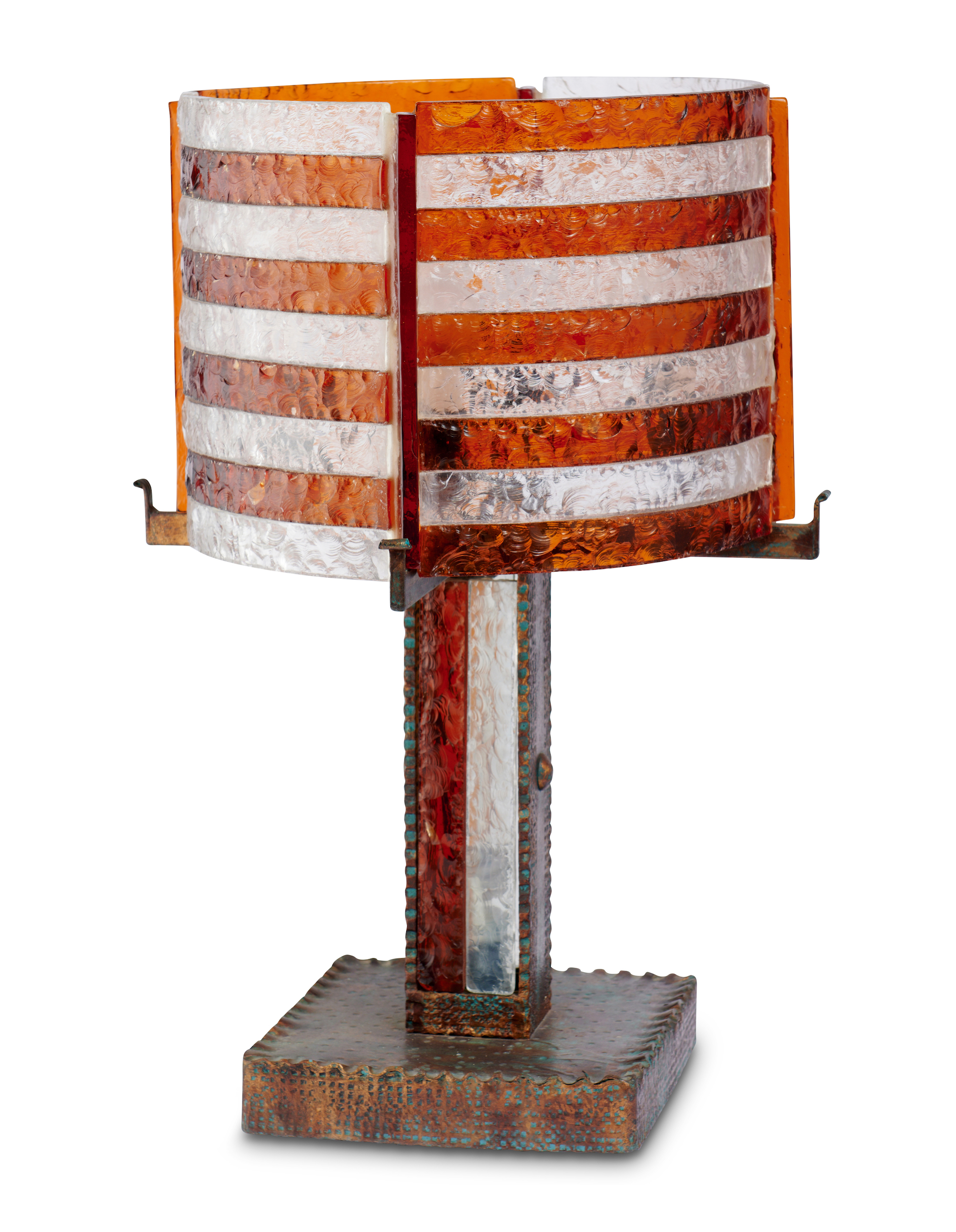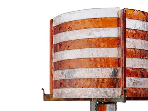 Hand sculptured glass panels and metal. Illuminated body and shade.