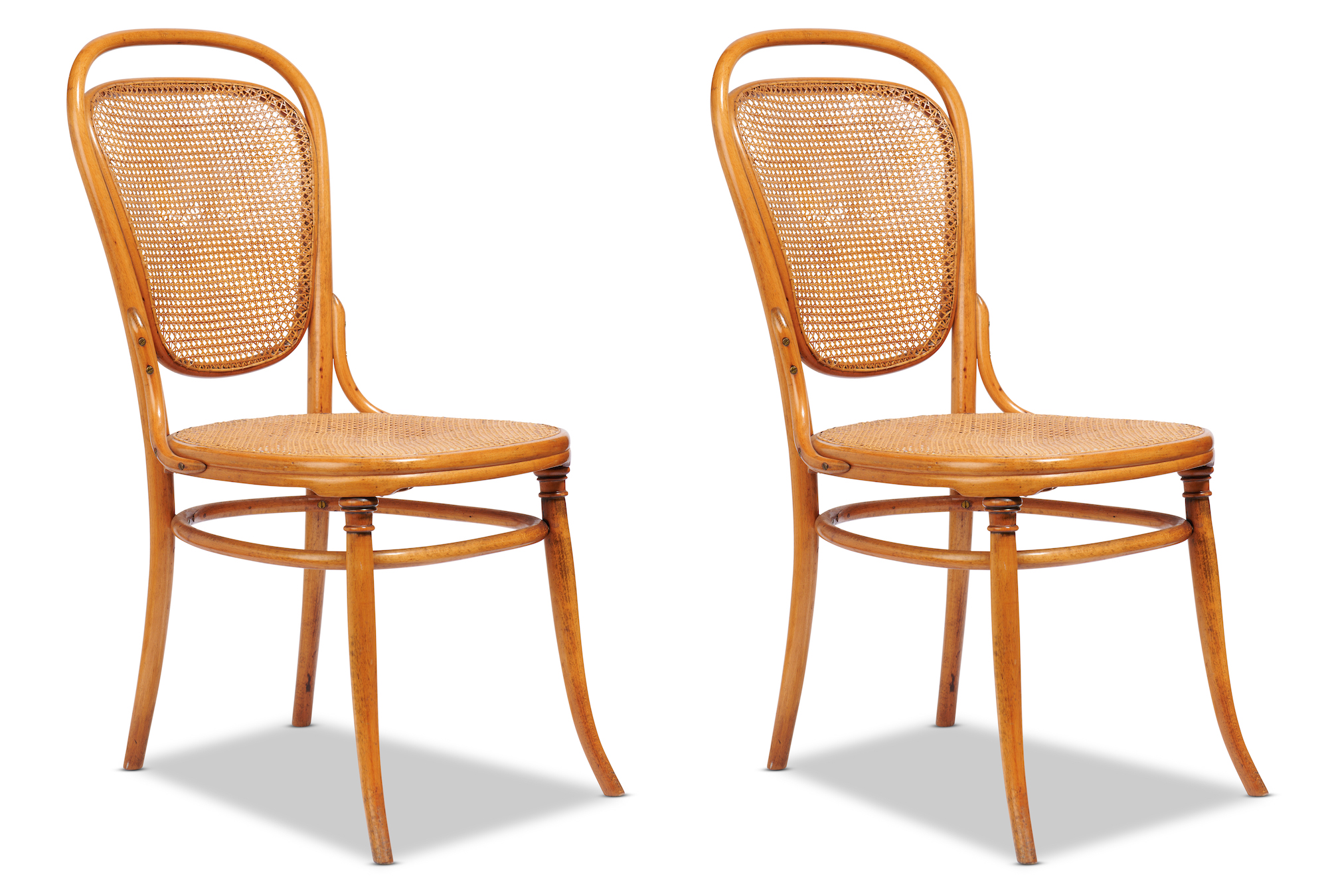 Both chairs have been restored to original condition. Minor surface scratches and marks consistent with age and use. One ochair has small 10cm loss to back seat rattan. Both chairs are structurally sound.