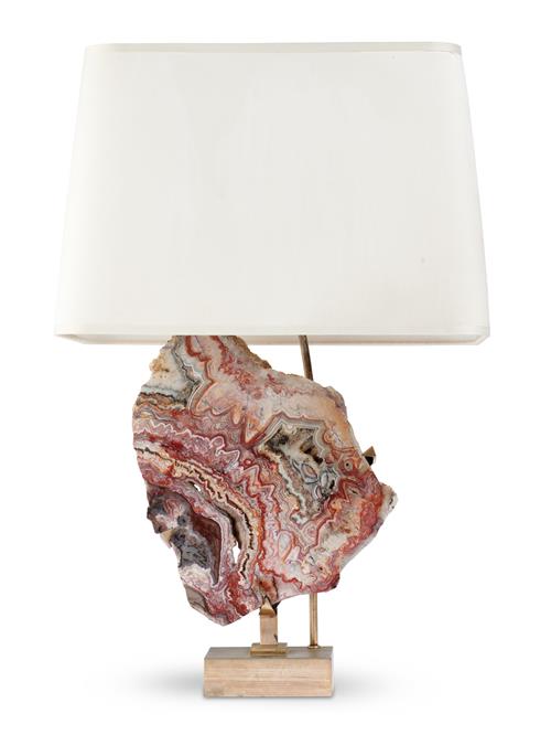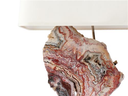 Large piece of agate set in brass claws. Brass base with linen shade.