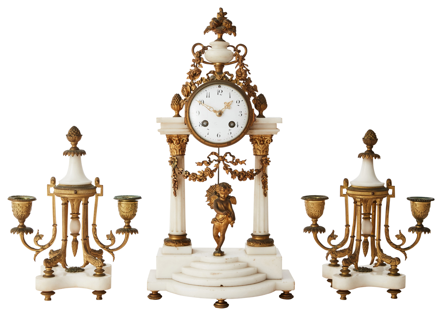 A FRENCH GILTMETAL AND WHITE MARBLE CLOCK GARNITURE