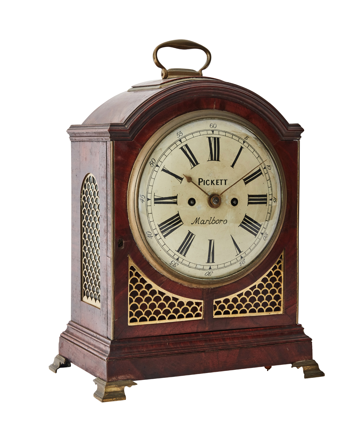 The painted dial with Roman numerals and Arabic minutes, signed: PICKETT / Marlboro, in brass bezel, the domed top with brass handle, having fish scale sound frets to the sides and spandrels on brass ogee bracket feet.