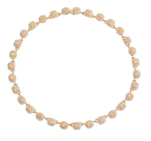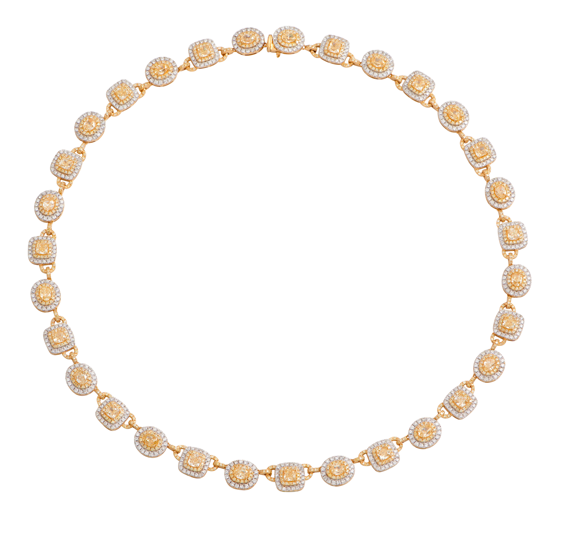 Comprising a series of alternating oval and cushion shaped clusters, each centring a fancy yellow diamond within a surround of further yellow and colourless diamonds, each spaced by yellow diamond set links, the yellow diamonds together weighing 17.52 carats the colourless diamonds together weighing 5.07 carats, completed by an invisible box clasp, length approximately 480mm.