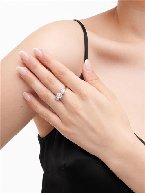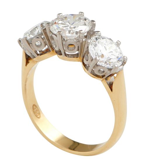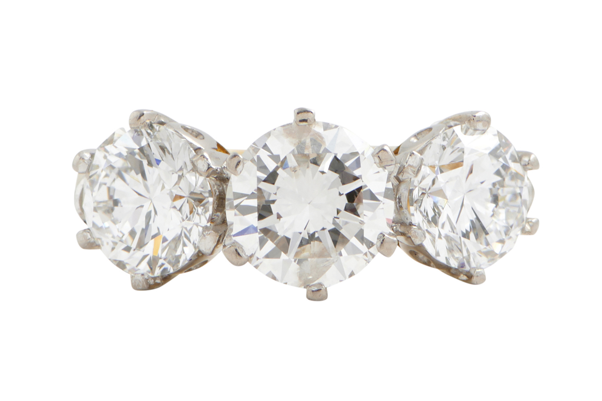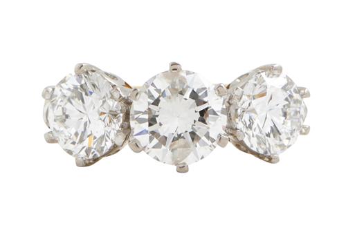 Comprising a claw-set brilliant-cut diamond weighing approximately 1.33 carats, flanked by further brilliant-cut diamonds together weighing approximately 2.09 carats, size P.
