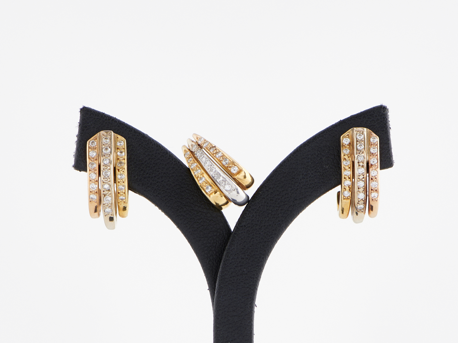A DIAMOND SET SUITE INCLUDING A PENDANT AND A PAIR OF EARRINGS TO POST AND BUTTERFLY FITTINGS, ALL IN 18CT TRI COLOUR GOLD, APPROXIMATE LENGTH OF BOTH EARRINGS AND PENDANT 17MM, APPROXIMATE WEIGHT10.19GMS