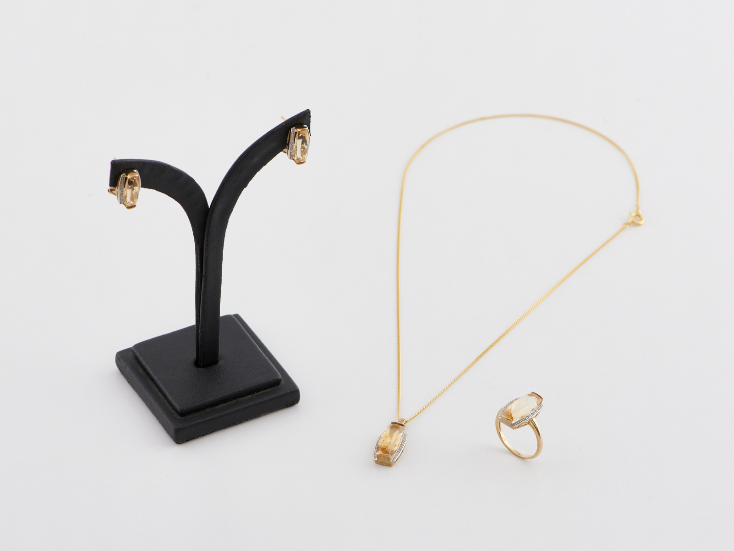 A CITRINE AND DIAMOND SET SUITE IN 9CT GOLD INCLUDING EARRINGS TO POST AND LEVERBACK FITTINGS, A RING (SIZE N) AND A PENDANT (CHAIN IN BASE METAL), TOTAL WEIGHT (MINUS CHAIN) 8.9GMS