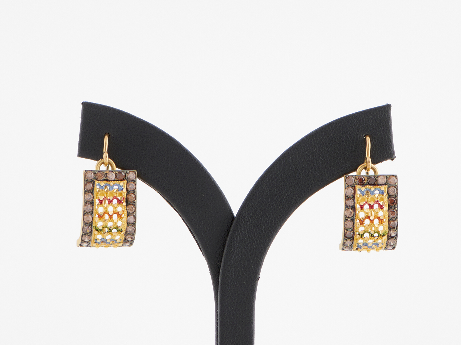 A PAIR OF GEM SET AND ENAMELLED EARRINGS IN 21CT GOLD, TO SHEPHERDS HOOKS IN 18CT GOLD, TOTAL WEIGHT 7.4GMS