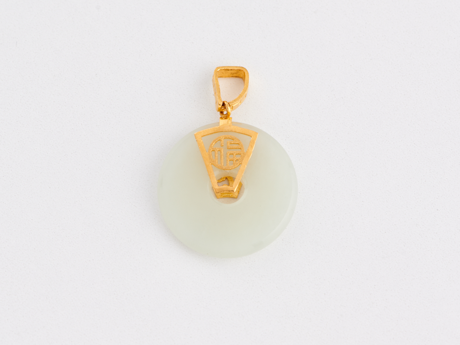 A JADE PENDANT IN 24CT GOLD, APPROXIMATE DIAMETER 25MM, TOTAL APPROXIMATE LENGTH 27MM, APPROXIMATE WEIGHT 7.8GMS