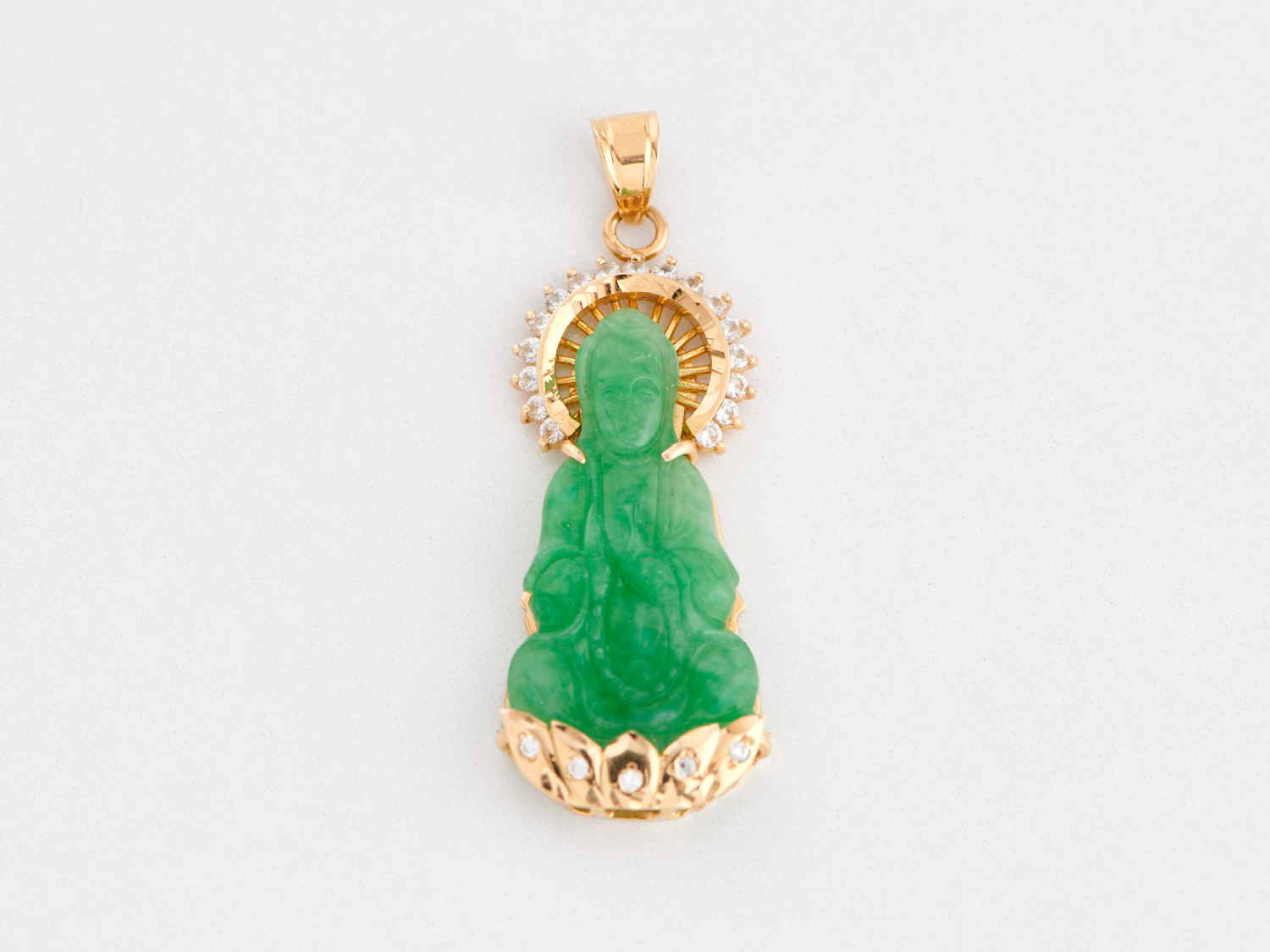 A CARVED JADE BUDDHA PENDANT IN 14CT GOLD, SIZE 43 X 15MM (WITHOUT BAIL), WEIGHT12.51GMS