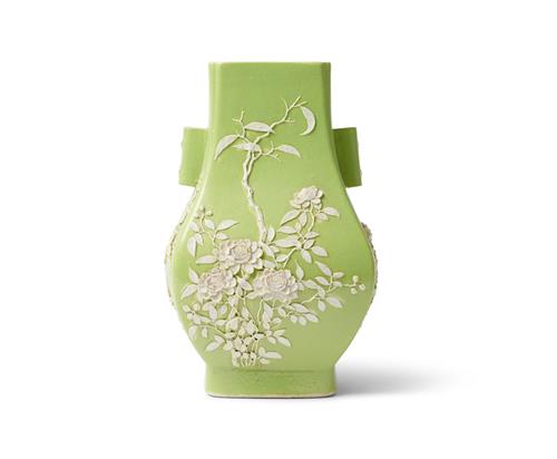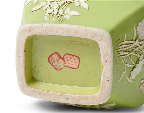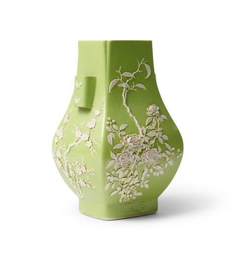 Of squared archaistic fang-hu form, decorated with relief applique and carved porcelain month rose, lotus and plum blossom with butterflies against a lime green enamel ground.
