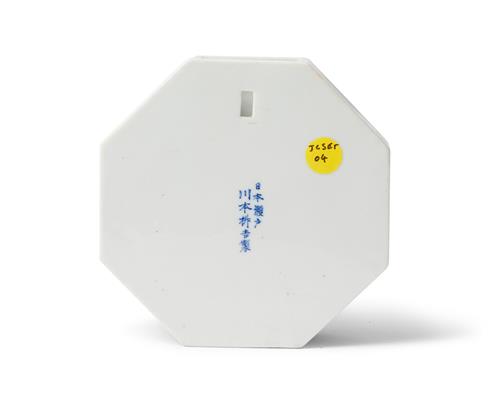 With a hole at the reverse for hanging on a wall, decorated in underglaze blue with a clock face to the front surrounded by naturalistically painted flowers. Signed to the base 'Nihon Seto Kawamoto Masukichi Sei'.